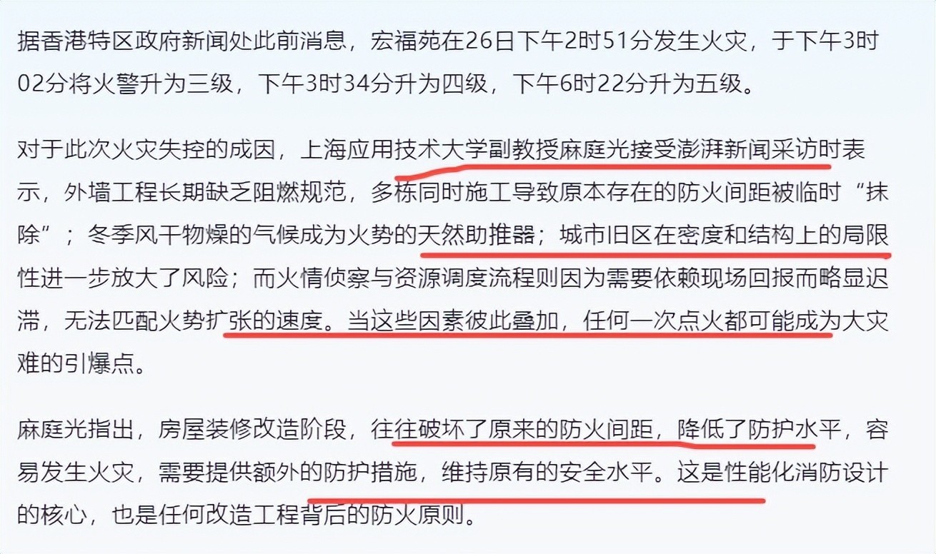 事实上,已有权威媒体指出,此次火灾成因多元:包括楼宇间距过窄、外墙长期缺乏阻燃处理、天气干燥以及竹制脚手架等因素共同作用所致。