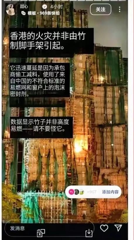 更令人啼笑皆非的是,她在帖文中还特别为竹子脚手架辩护,称“竹材并非高度易燃,请勿责怪它”。