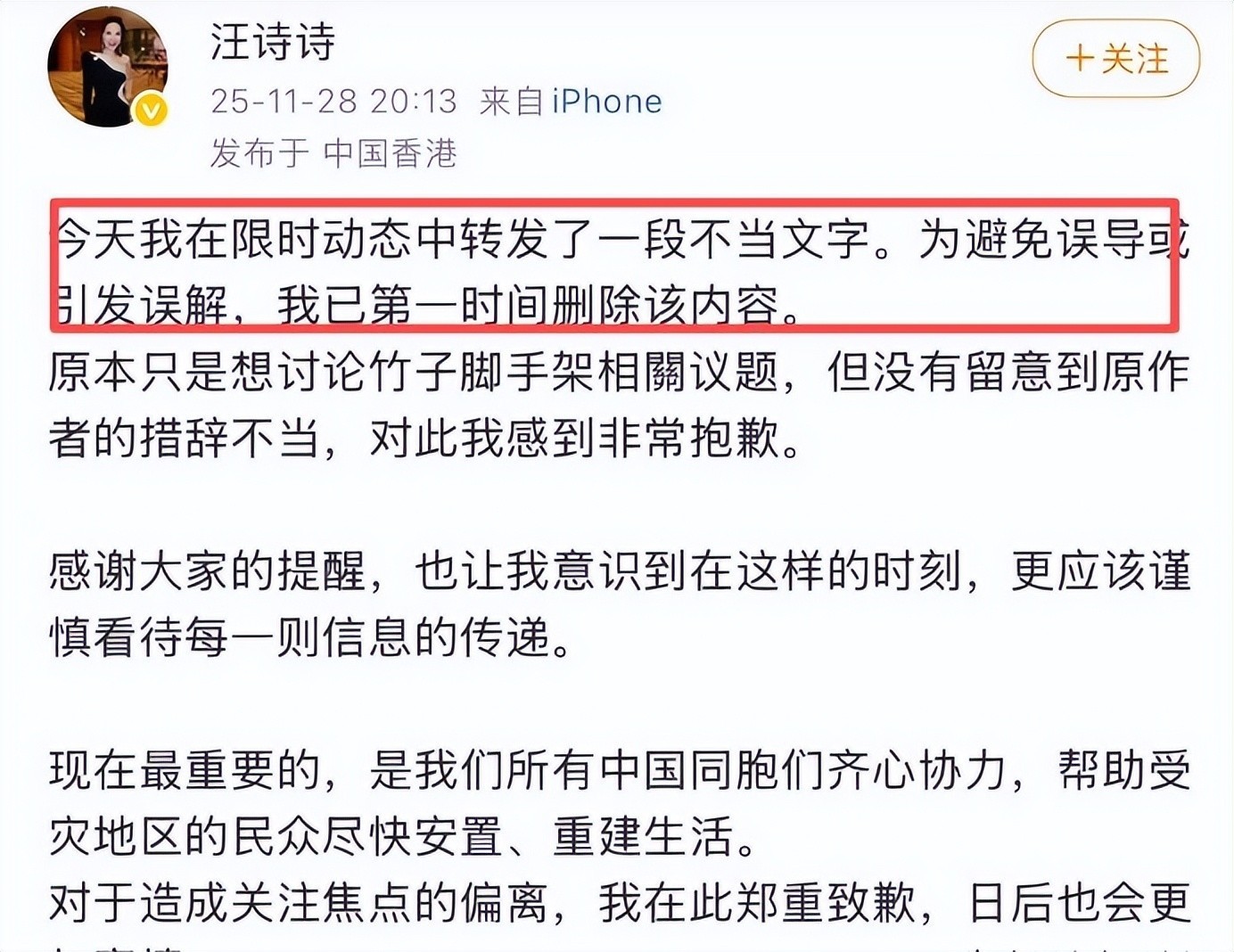 不久后,汪诗诗删除原始帖文,并在微博发文致歉,辩称自己未仔细核实信息真伪,误信了错误内容。